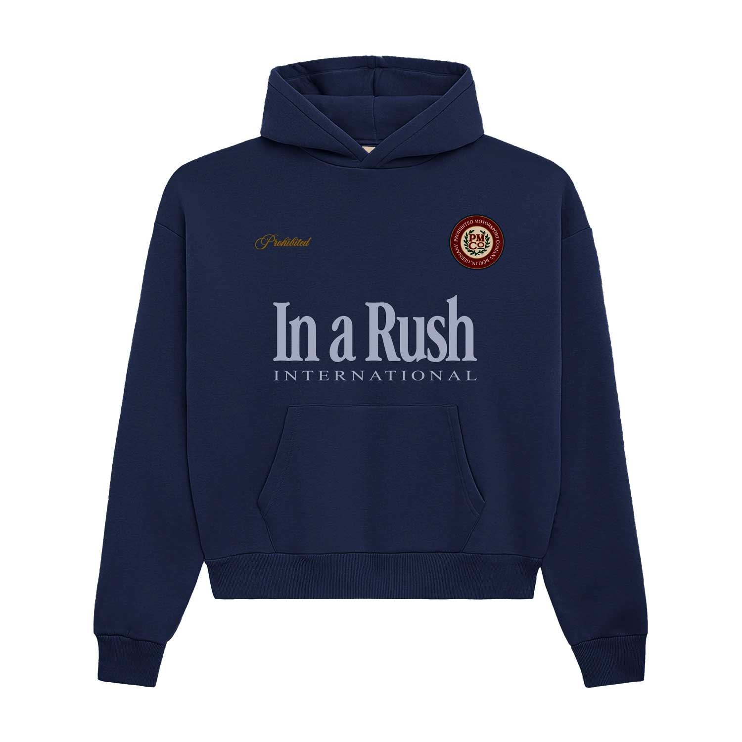 Felpa dal fit oversized, realizzata in misto cotone e poliestere (360 GSM) per garantire comfort e resistenza. Presenta ricamo “Prohibited” sul lato destro del petto, patch PMCO sul lato sinistro, stampa “In a Rush” sul davanti e ricamo “Modern Yuppies” sulla cappuccia, per uno stile contemporaneo e distintivo.