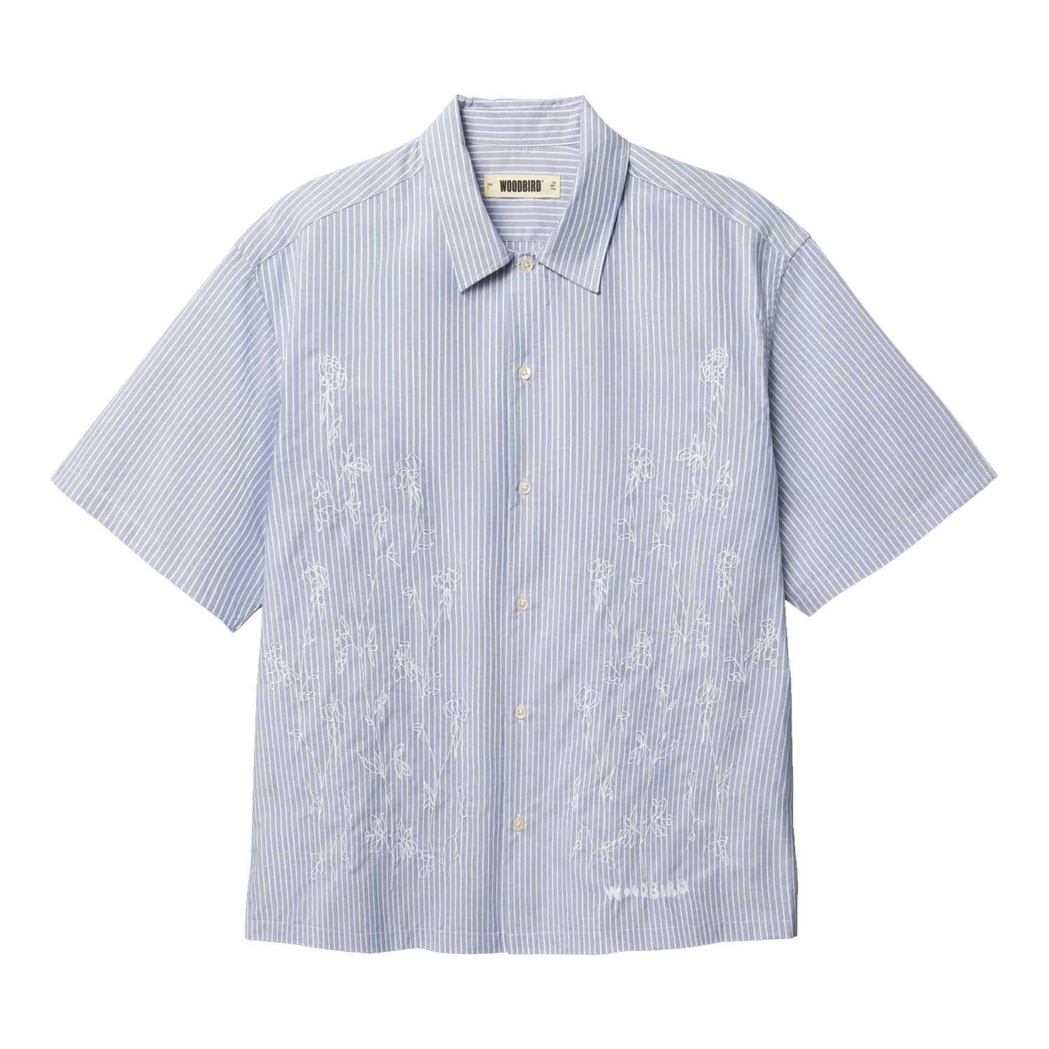 Camicia a manica corta dal fit morbido e rilassato, caratterizzata da una silhouette boxy contemporanea. Il design essenziale con colletto classico e abbottonatura frontale è arricchito da righe verticali e delicati ricami floreali sul davanti, per un dettaglio discreto ma distintivo.